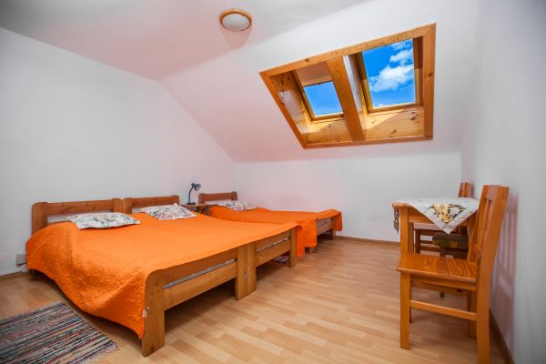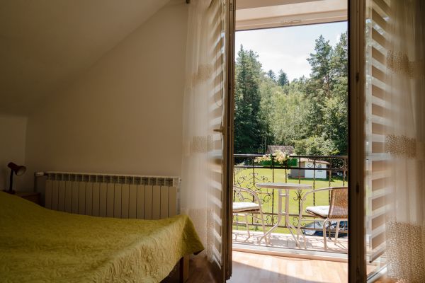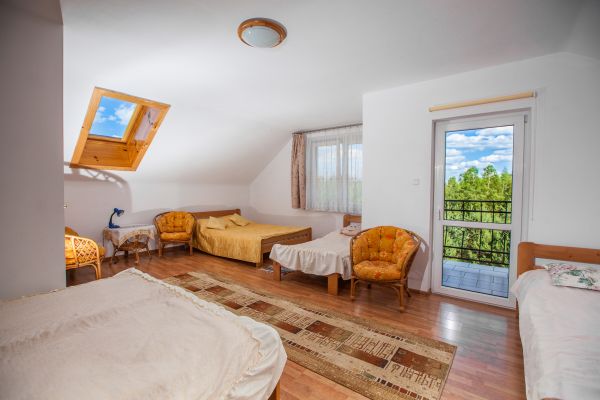 Obiekt położony jest w spokojnej, zielonej części Krasnobrodu – w bezpośrednim sąsiedztwie lasu i zaledwie 200 metrów od zalewu. Do dyspozycji gości przygotowano pięć nowocześnie urządzonych pokoi z prywatnymi łazienkami oraz domek z werandą, usytuowany tuż pod lasem. Teren posesji jest ogrodzony, co zapewnia bezpieczeństwo i komfort, szczególnie rodzinom z dziećmi. Pokoje 2-, 3- i 6-osobowe posiadają dostęp do tarasów. Goście mogą korzystać z ogólnodostępnego, w pełni wyposażonego aneksu kuchennego (kuchnia indukcyjna z piekarnikiem, mikrofala, ekspres do kawy). W każdym pokoju znajduje się telewizor, lodówka oraz czajnik elektryczny. Na terenie całego obiektu dostępna jest sieć Wi-Fi.