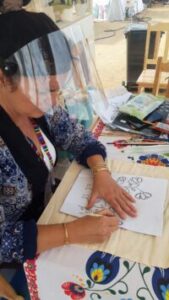Twórczyni ludowa z „Pracownia Rękodzieła – Wioletta Mazurek”. Zajmuje się upiększaniem i ozdabianiem przedmiotów oraz dekorowaniem wnętrz dekoracją kwiatową. W trakcie warsztatu np. z dekoracji na tkaninie, uczestniczki i uczestnicy poznają zasady odbijania szablonów na tkaninach przy użyciu farb akrylowych i wałków. Szablony odbija się na torbach bawełnianych.